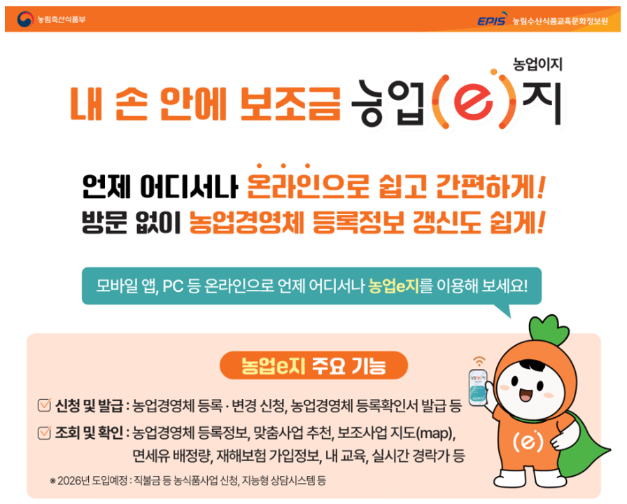 정보를 몰라 혜택을 놓치고 계셨다면, 지금 바로 '농업e지' 가입으로 농업인의 권리와 혜택 꼭 챙기시기 바라겠습니다.