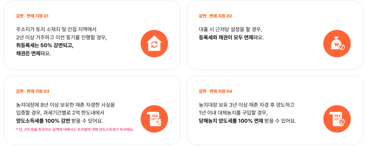 | 세금 감면 | 취등록세 50% 감면, 8년 자경 시 양도세 감면(2억 한도) |