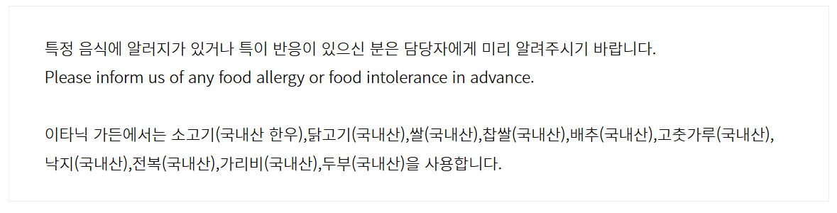 - 알러지 유의: 알러지 재료는 예약 시 미리 말씀해 주셔야 대체 가능하며, 당일 조정은 어렵습니다.