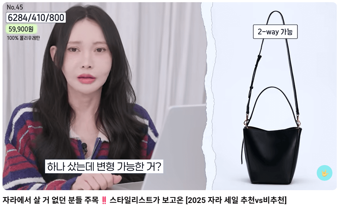| 6284/410/800 | 버킷백 (가방) | [역대급 가성비] 더로우 저렴이. 퀄리티 훌륭하며 투웨이 끈+파우치 제공. 할인 없이도 살 가치가 있다고 평가. |