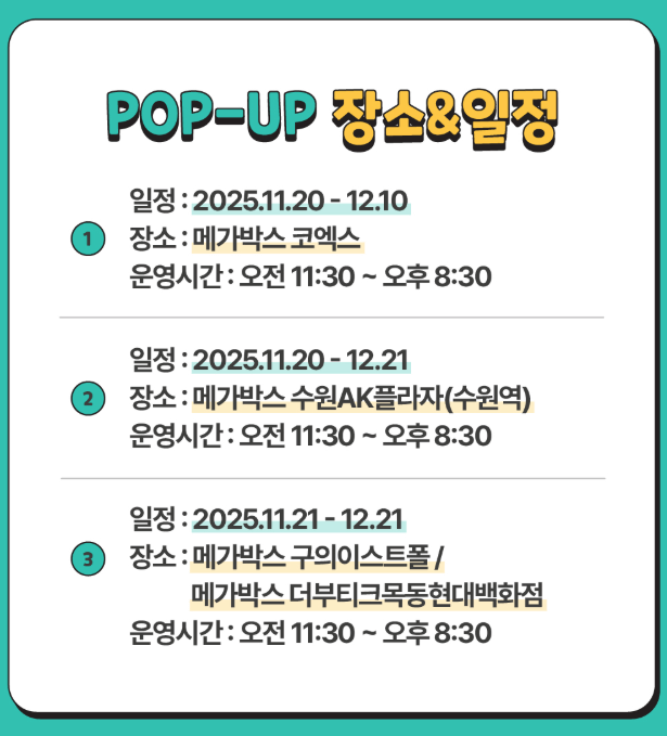 | **3** | 메가박스 구의이스트폴 / 더부티크목동현대백화점 | 2025.11.21 - 12.21 | 오전 11:30 ~ 오후 8:30 |