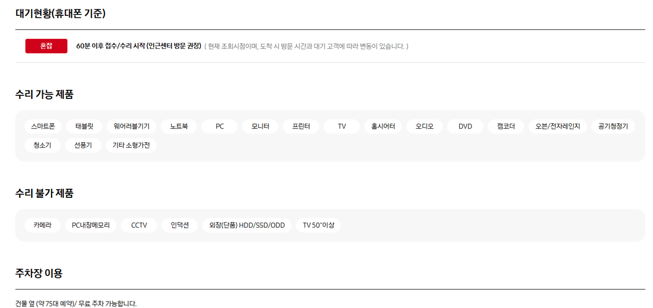휴대폰, 태블릿, 웨어러블 제품은 모바일 센터 예약 시스템을 이용할 수 있습니다. 모바일센터 예약은 아래 링크를 통해 진행하세요.