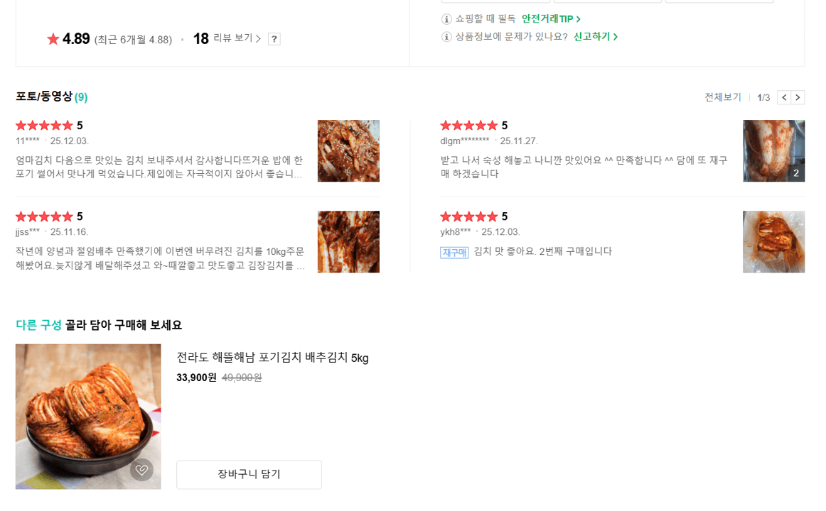 - 배추 크기 및 상태 불균형: 일부 상품에서 "중량 맞추기 위한 허접한 배추가 있었다", "배추가 너무 작다"는 의견이 있어, 배추 크기가 균일하지 않은 경우가 발생할 수 있습니다.
