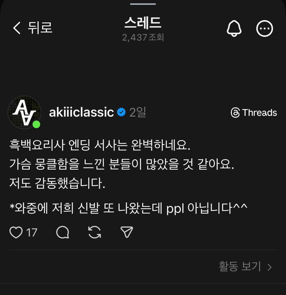 사실상 비즈니스 관계에서 인사치레로 넘길 수 있는 말이었지만, 최 셰프는 이를 잊지 않았습니다. 1년이 지난 후 '흑백요리사2' 촬영장에 그는 실제로 직접 구매한 아키클래식 운동화를 신고 등장하여 약속을 지켰습니다.