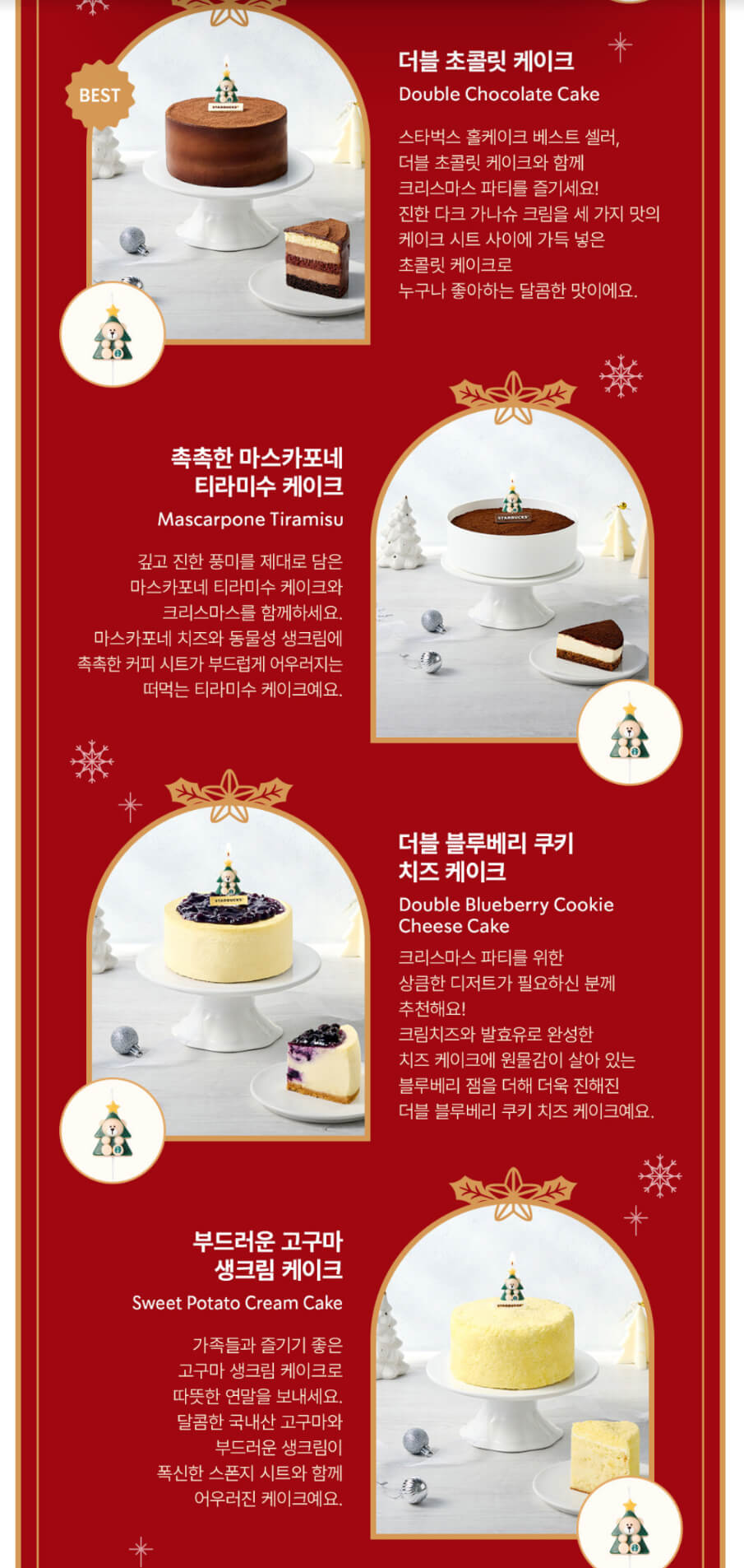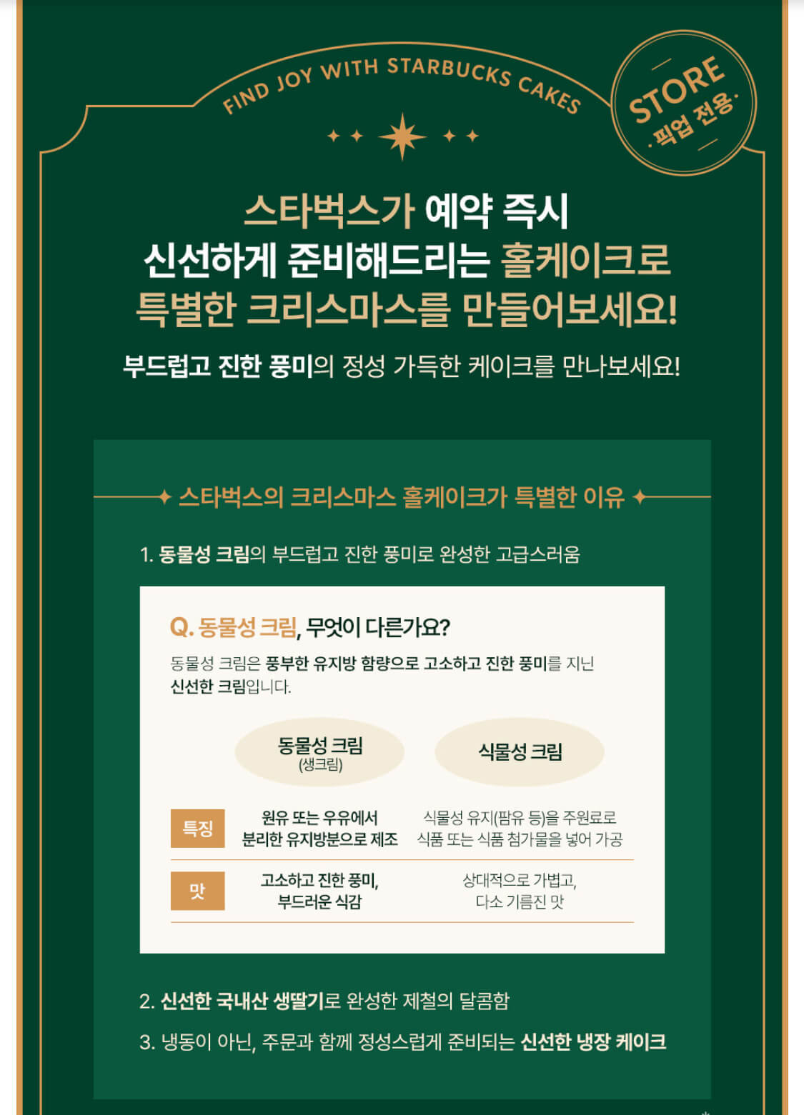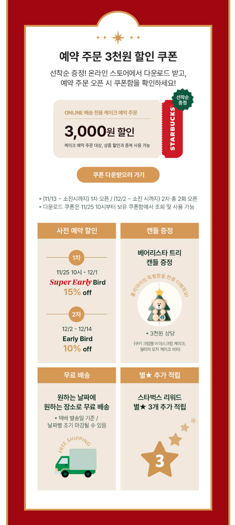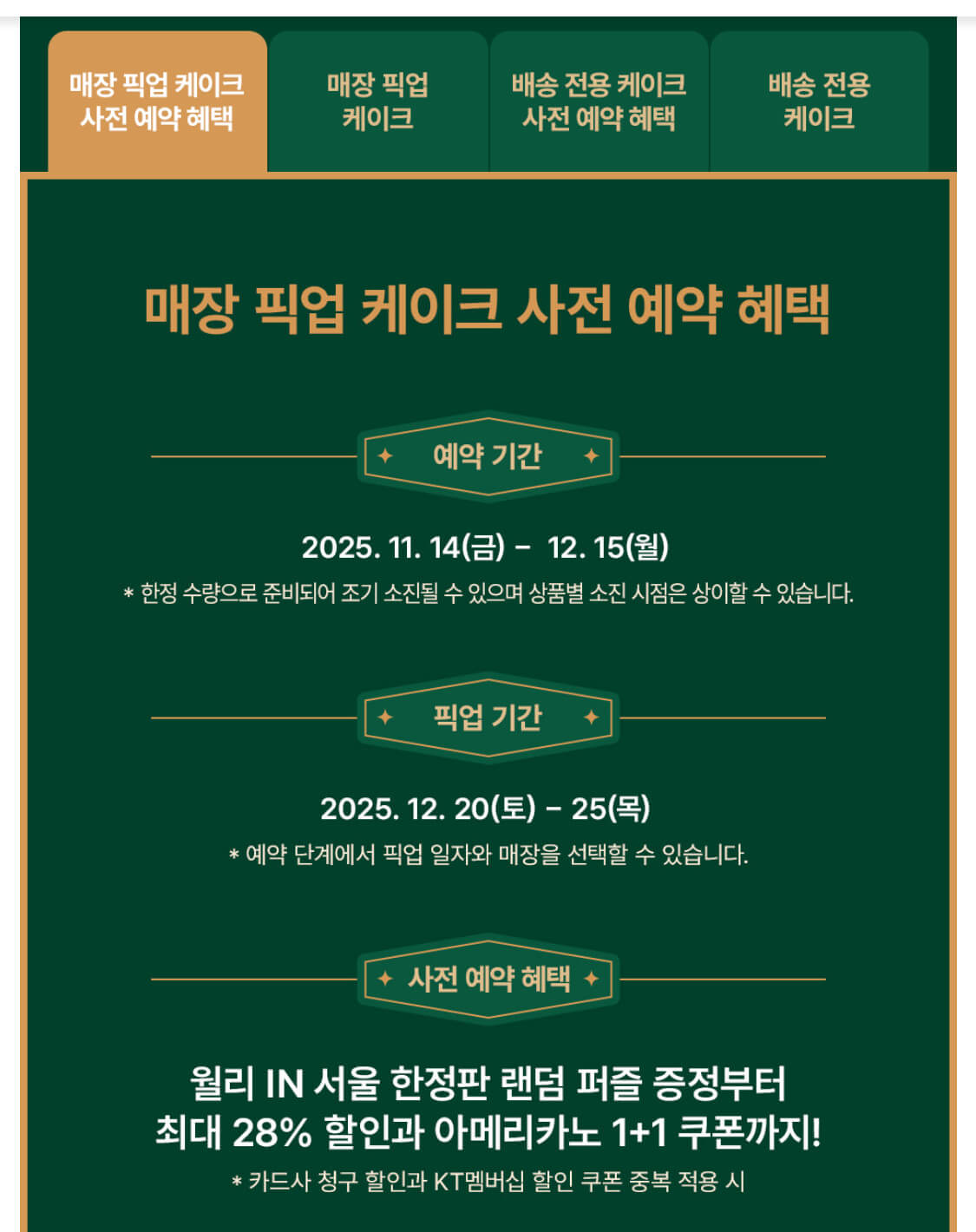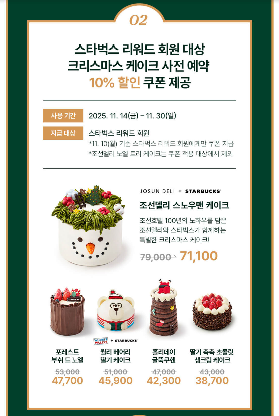 - 혜택 2. 리워드 회원 10% 쿠폰: 11월 10일 기준 멤버십 회원에게 크리스마스 케이크 *10% 할인 쿠폰*이 지급돼요. (사용 기간: 11/14 ~ 11/30).
