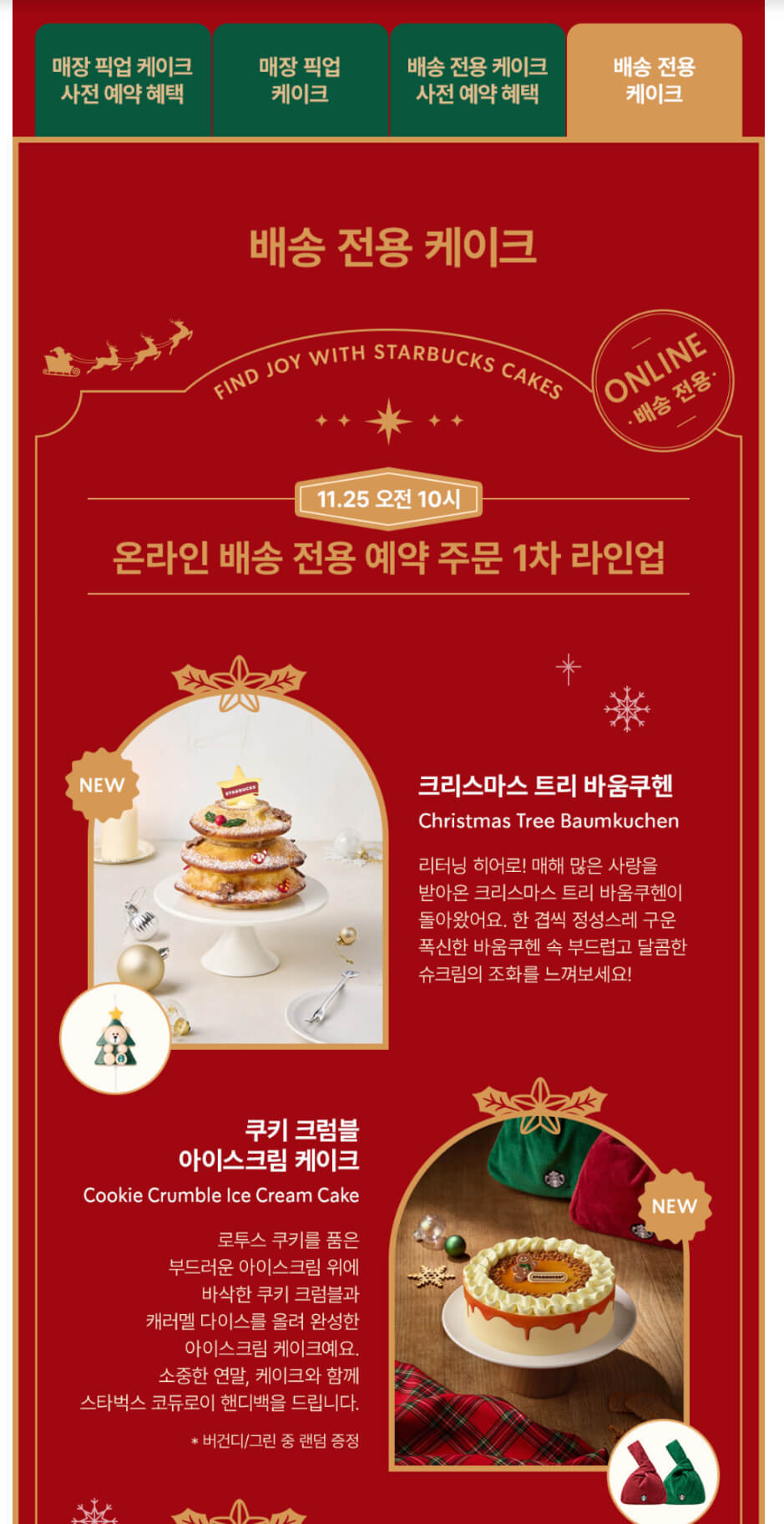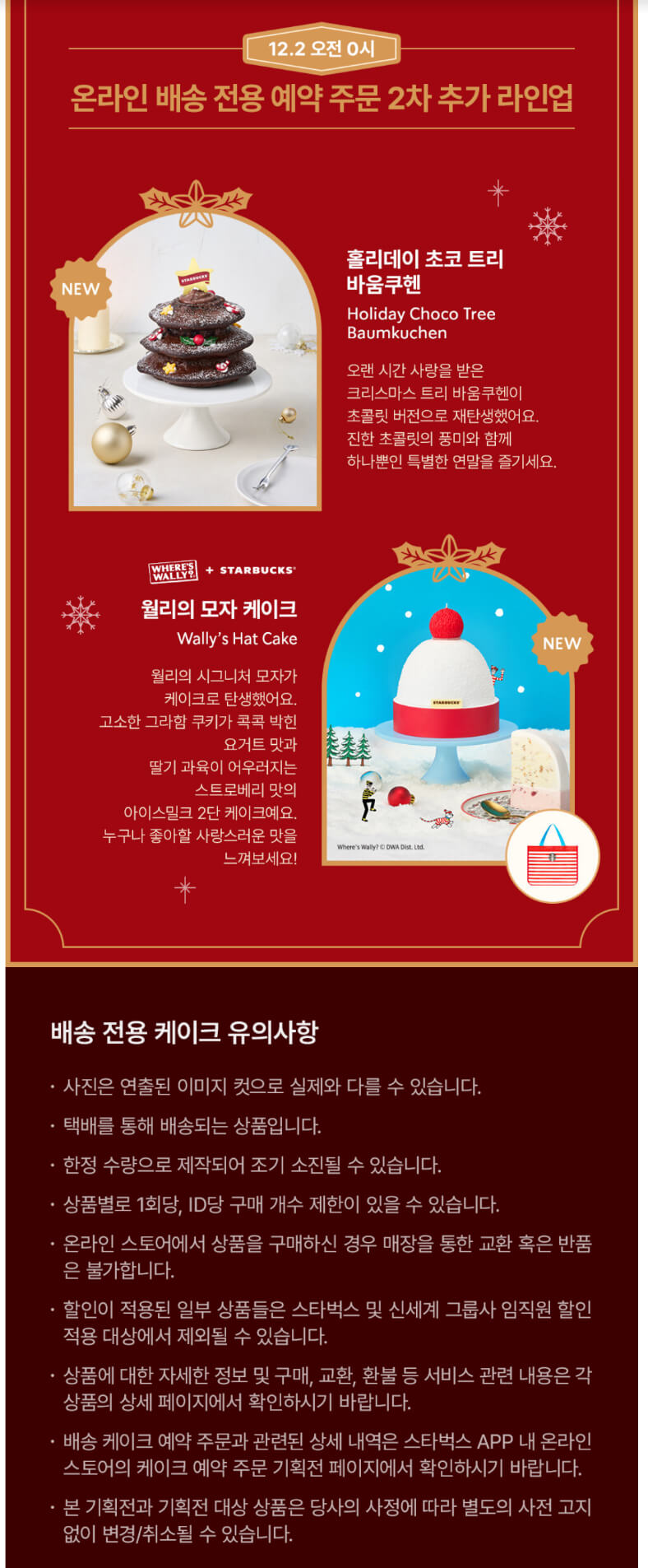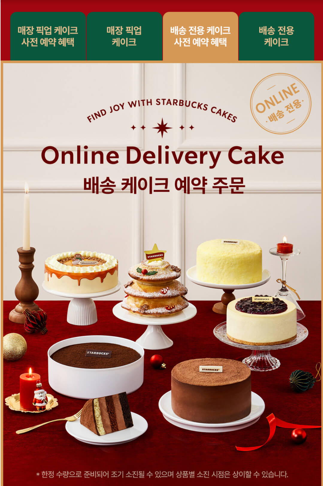 배송 전용 케이크 주문은 스타벅스 모바일 앱 내 온라인 스토어를 통해서만 가능하며, 예약 일정이 1차와 2차로 나뉘어 있습니다.