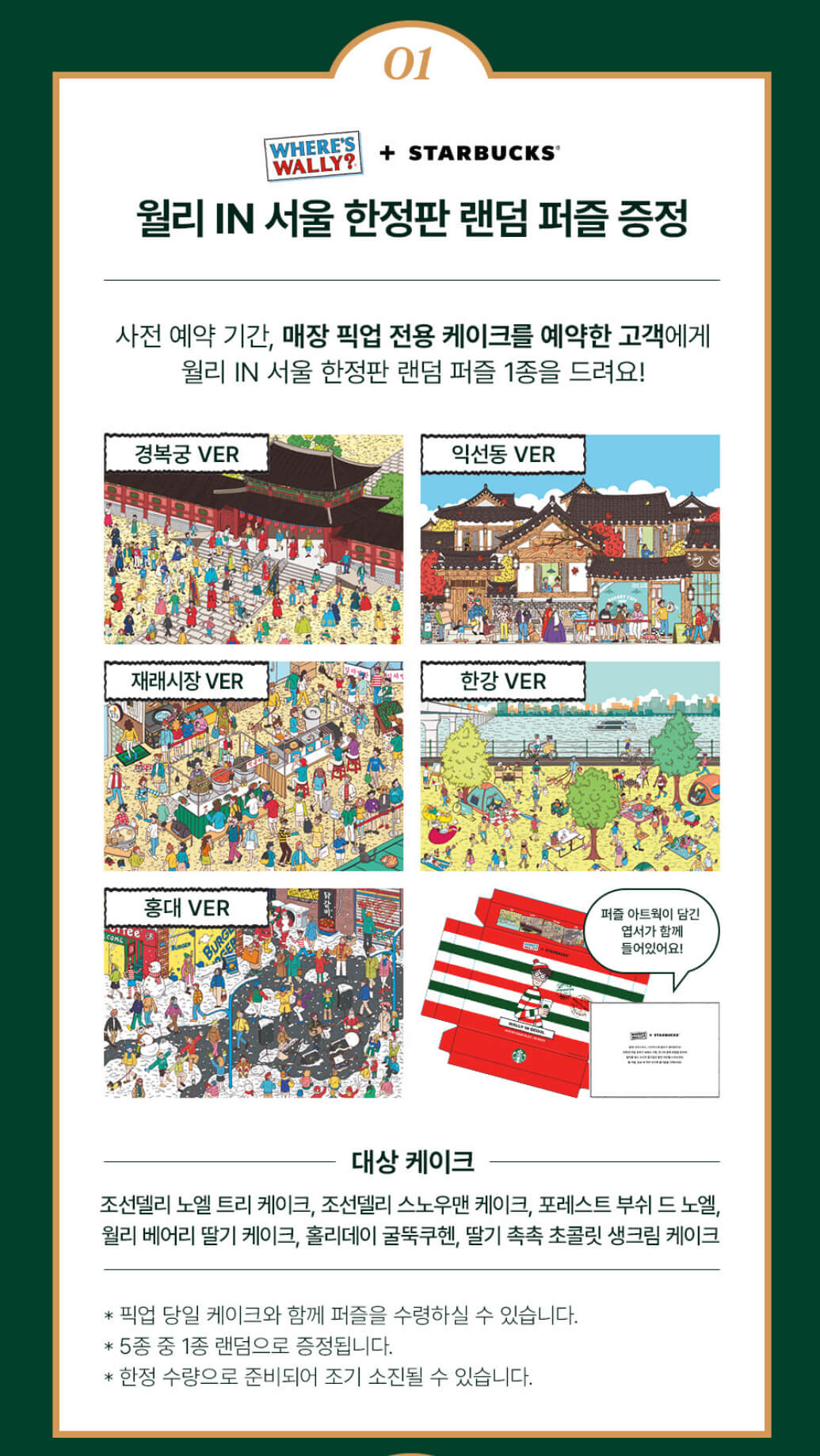 - 혜택 1. 월리 한정판 퍼즐 증정: 사전 예약 고객 전원에게 '월리 IN 서울' 한정판 랜덤 퍼즐 1종이 선물로 증정됩니다. (5종 중 무작위). 조선델리 케이크 등 선별된 6종 케이크를 예약하면 받을 수 있습니다.