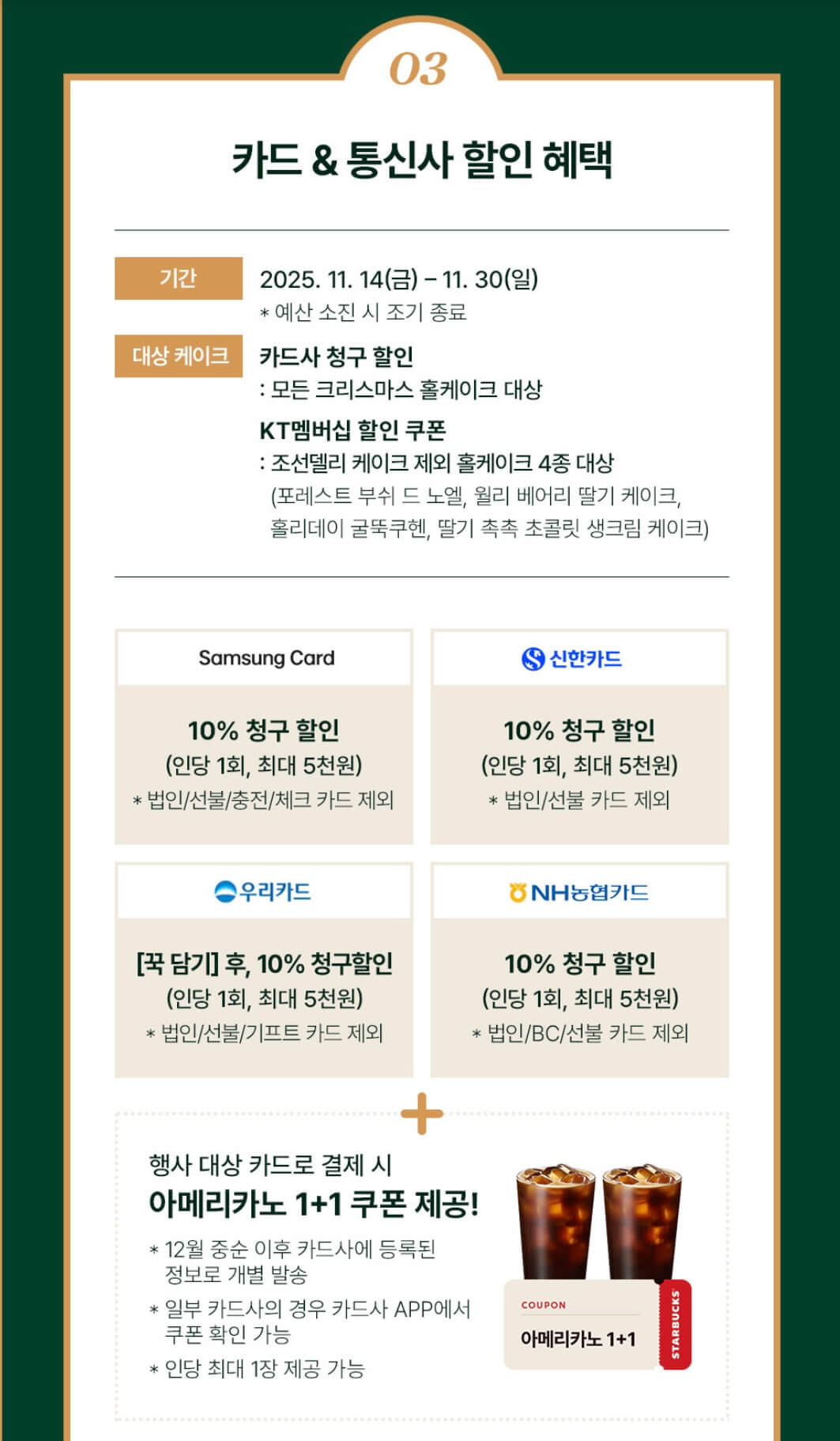 - 혜택 4. 아메리카노 1+1 쿠폰: 프로모션 대상 카드로 케이크를 결제하면, 12월 이후 아메리카노 1+1 쿠폰이 추가로 따라와요. (1인당 최대 1장)