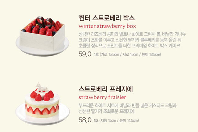 | 윈터 스트로베리 박스 | 59,000 | 1호 (15.5cm) | 딸기와 블루베리가 가득 올라가 시선을 사로잡는 프리미엄 박스 형태. |