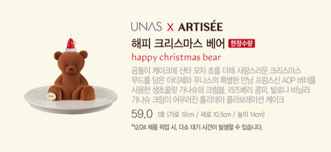 | 해피 크리스마스 베어 | 59,000 | 1호 (지름 12cm) | 유명 디저트 브랜드 유나스(UNAS)와 협업한 한정판. 사랑스러운 곰 디자인에 프랑스 AOP 버터를 사용한 고급스러운 풍미가 특징입니다. (미식가와 특별한 선물을 찾는 분께 추천) |