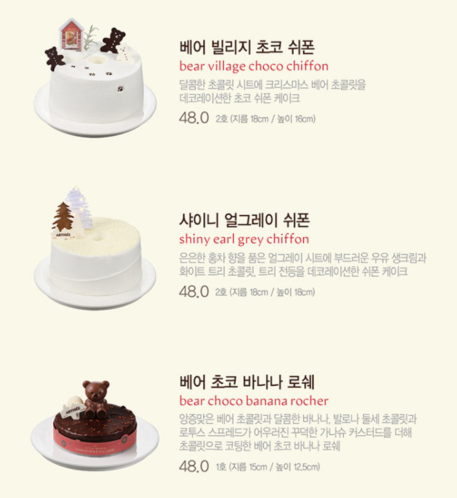 | 베어 빌리지 초코 쉬폰 | 48,000 | 2호 (16cm) | 달콤한 초콜릿 시트에 귀여운 크리스마스 베어 데코가 올라간 정통 초코 쉬폰. |