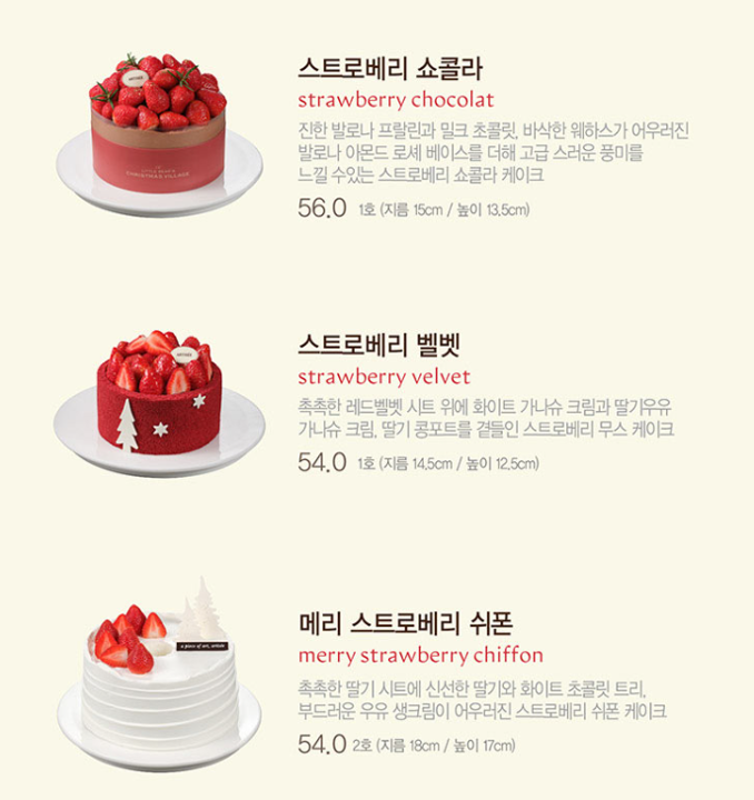 | 메리 스트로베리 쉬폰 | 54,000 | 2호 (18cm) | 딸기 시트와 신선한 딸기, 화이트 초콜릿 트리가 올라간 기본 쉬폰 케이크. |